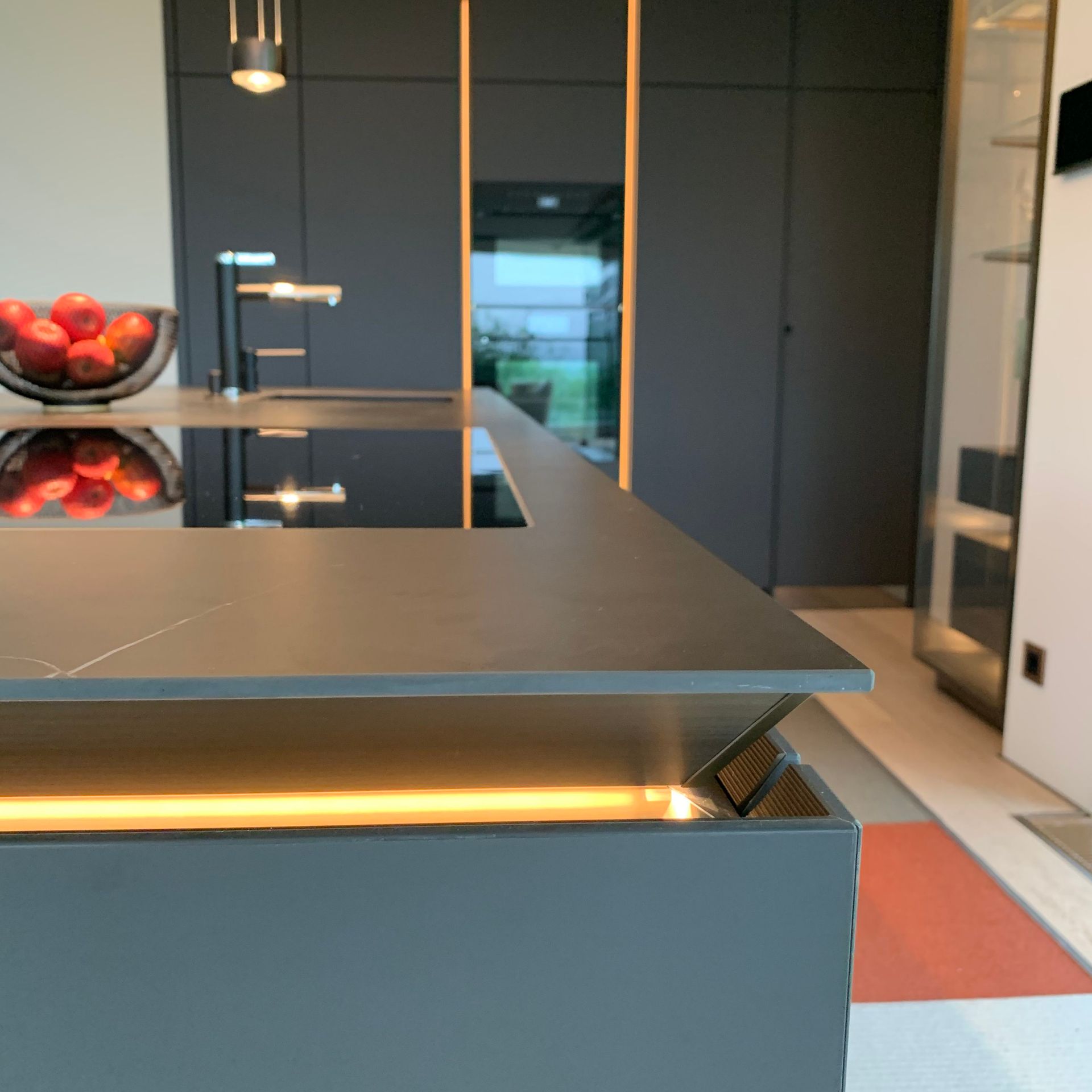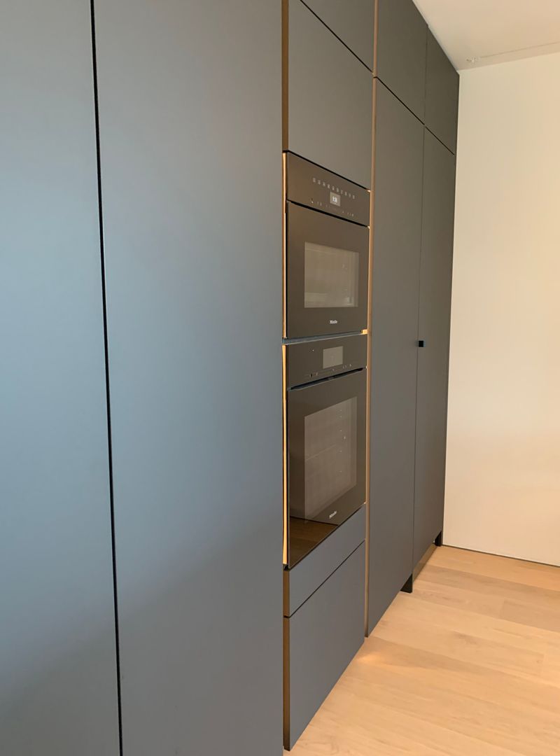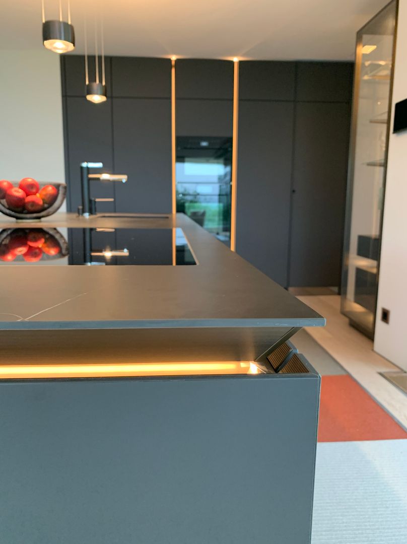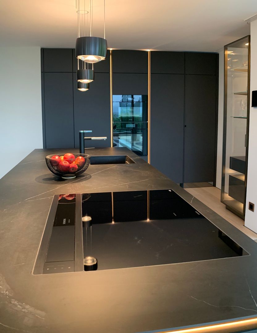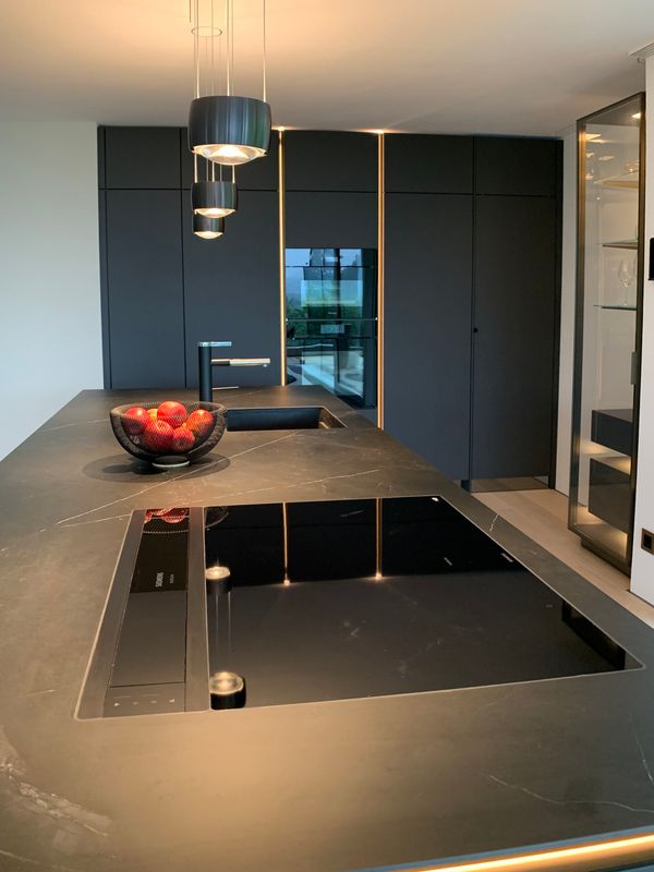 Küche SLX graphitgrau, Keramikplatte Storm Negro 6 mm, Metall bronze eloxiert mit LED Beleuchtung, Spiegelsockel rauchgrau, individuelle Inneneinteilung der Schubladen, Durchgangstüre nach innen in Vorratsraum