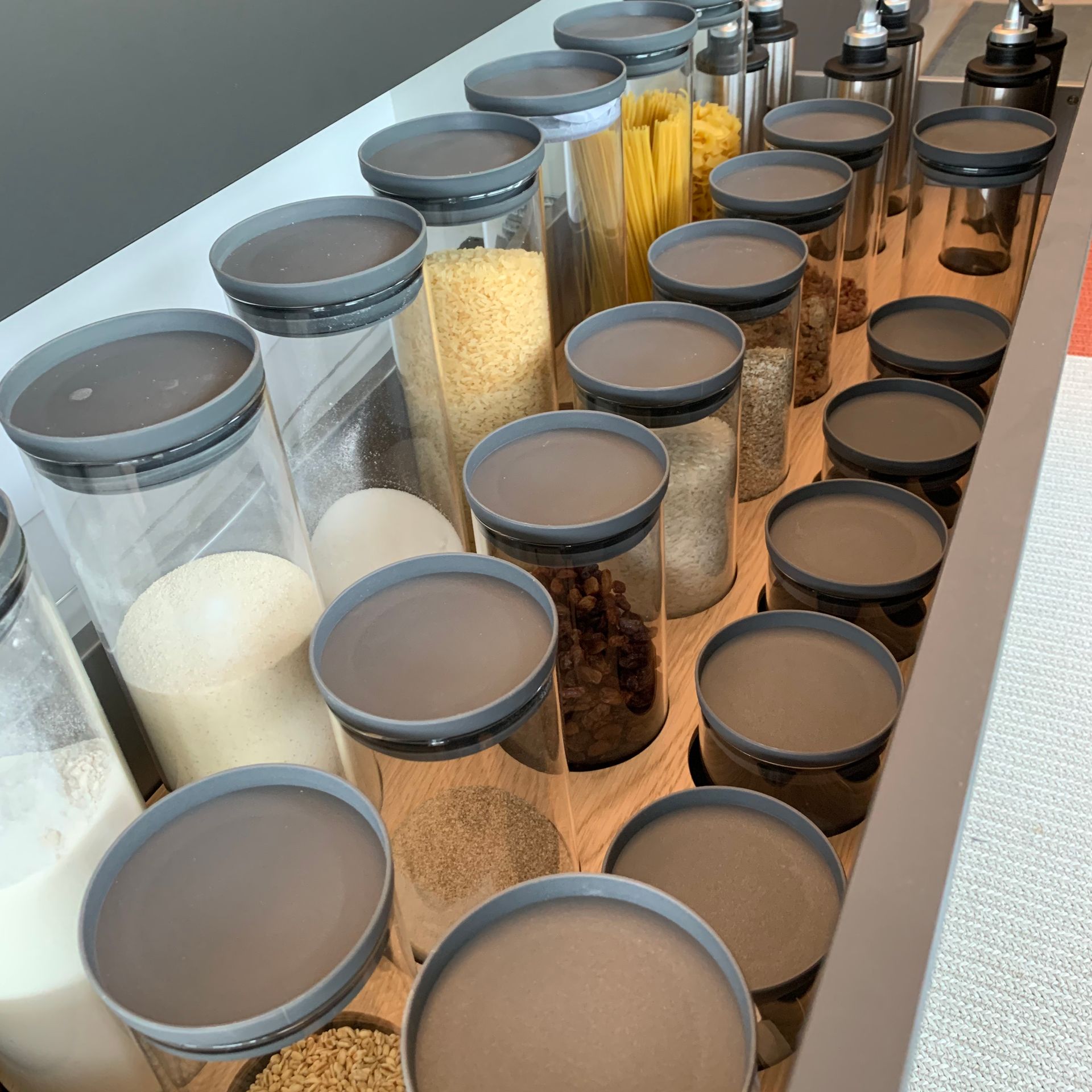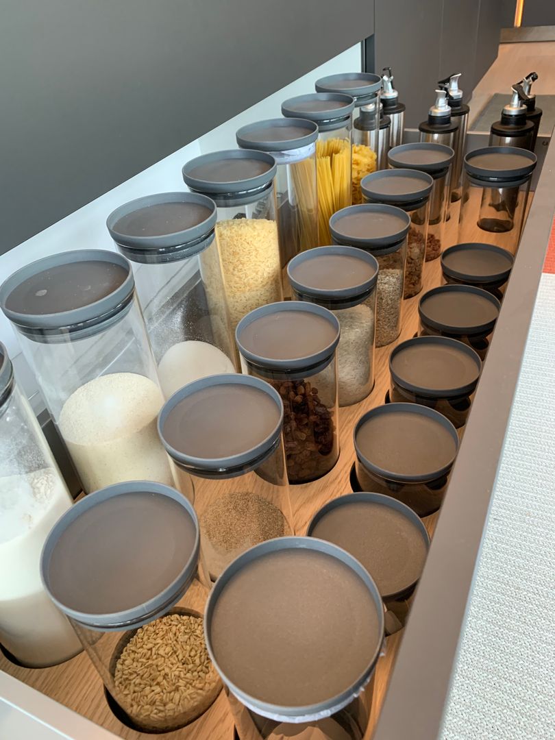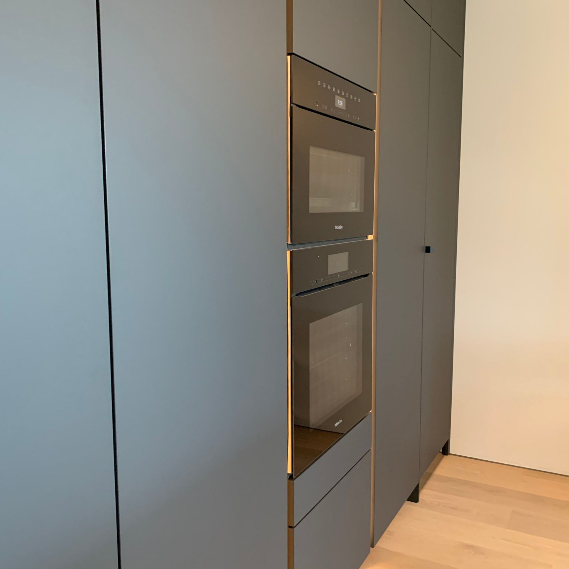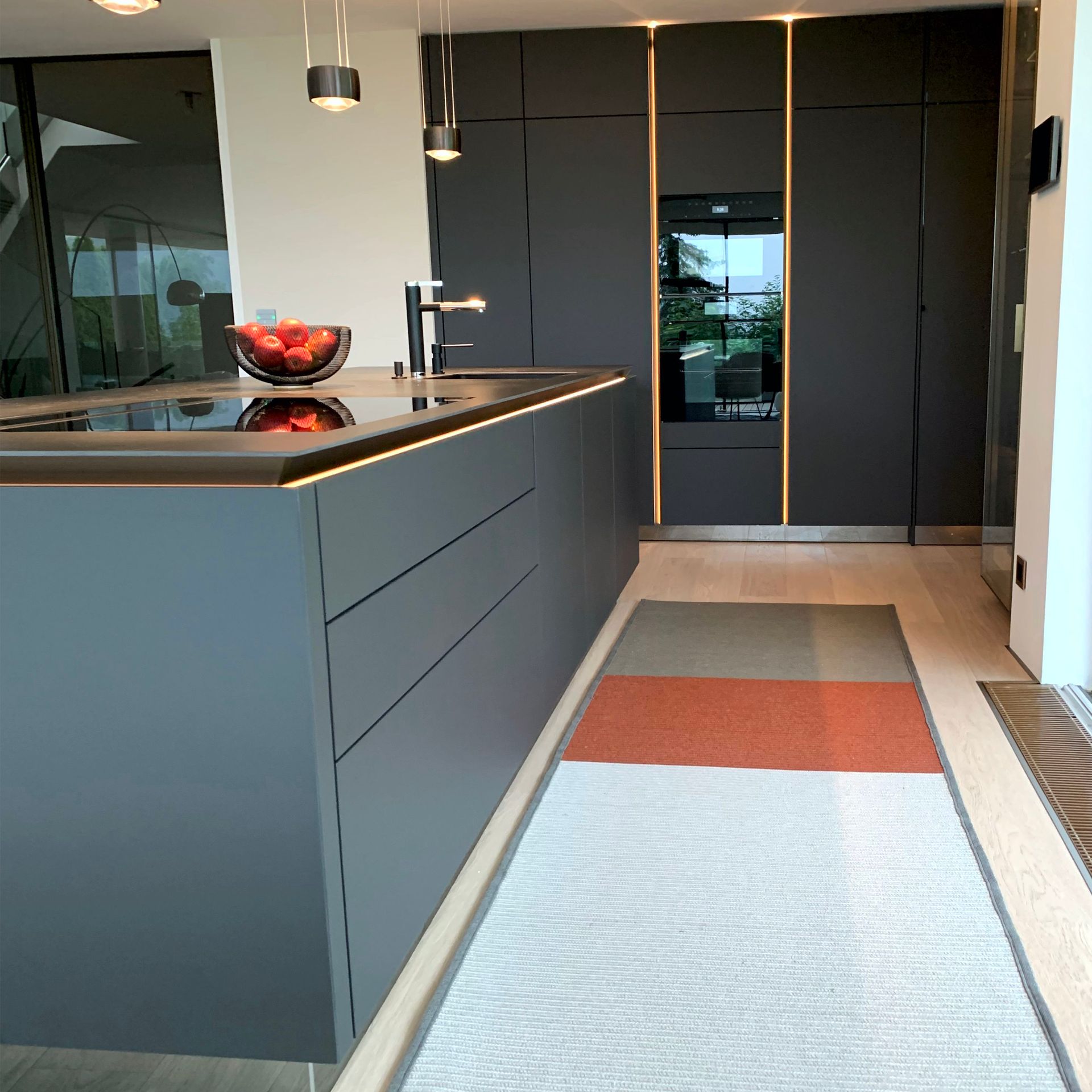 Küche SLX graphitgrau, Keramikplatte Storm Negro 6 mm, Metall bronze eloxiert mit LED Beleuchtung, Spiegelsockel rauchgrau, individuelle Inneneinteilung der Schubladen, Durchgangstüre nach innen in Vorratsraum