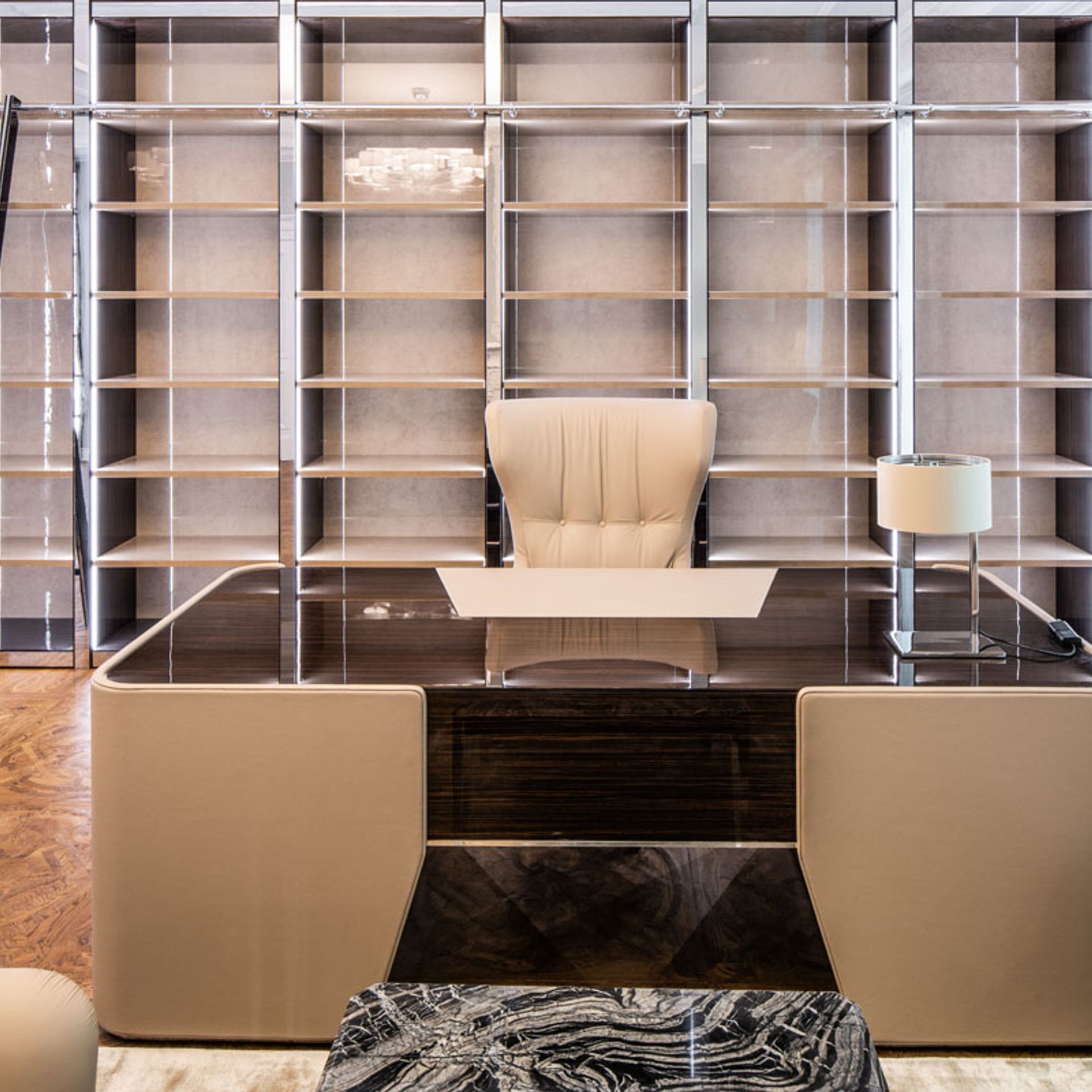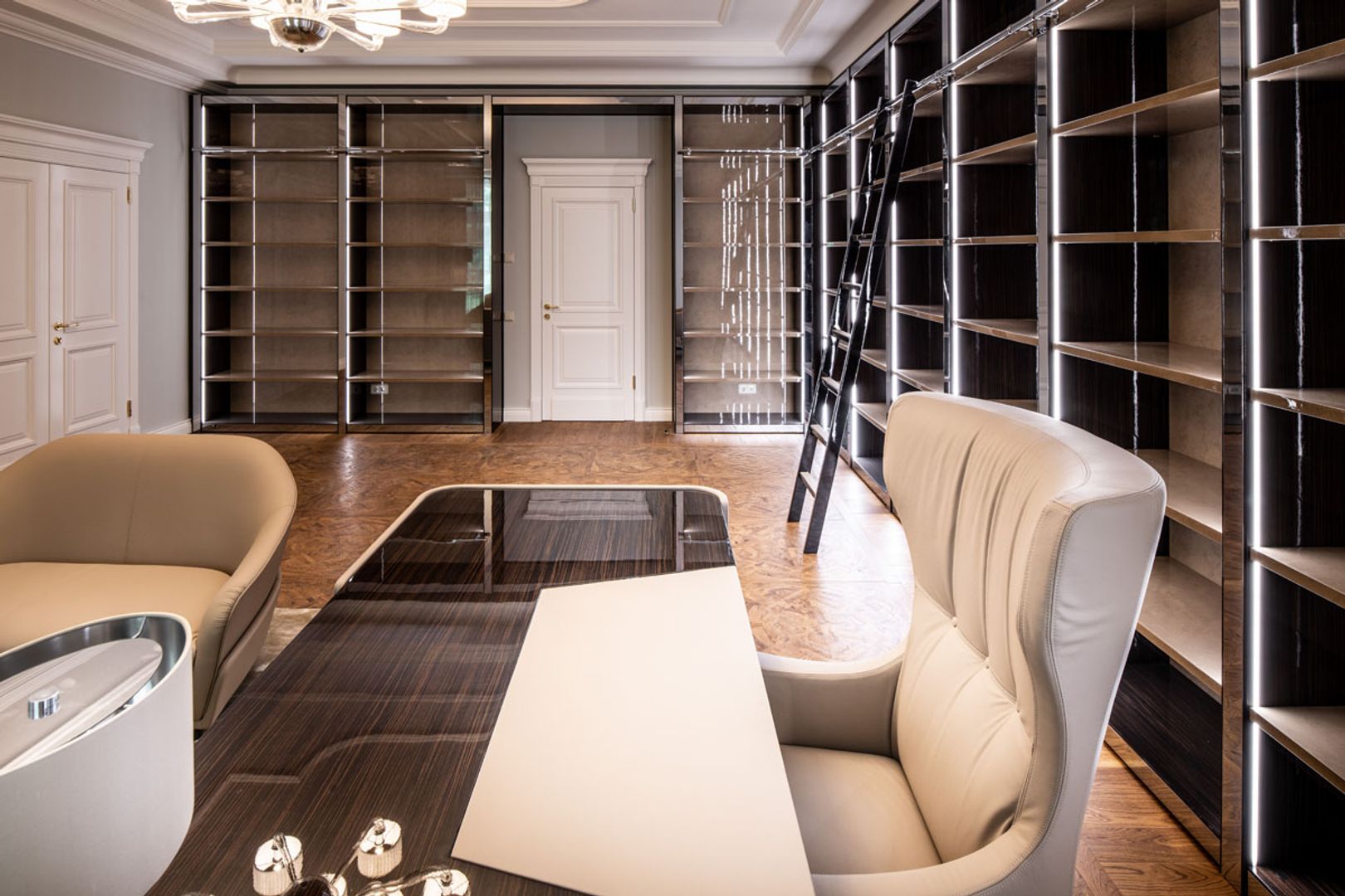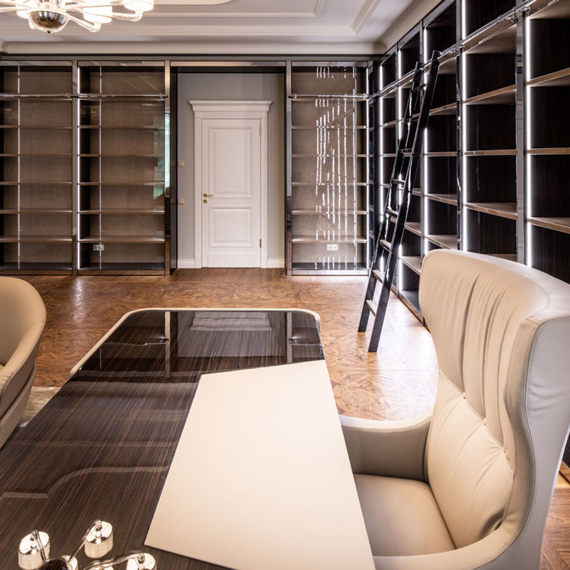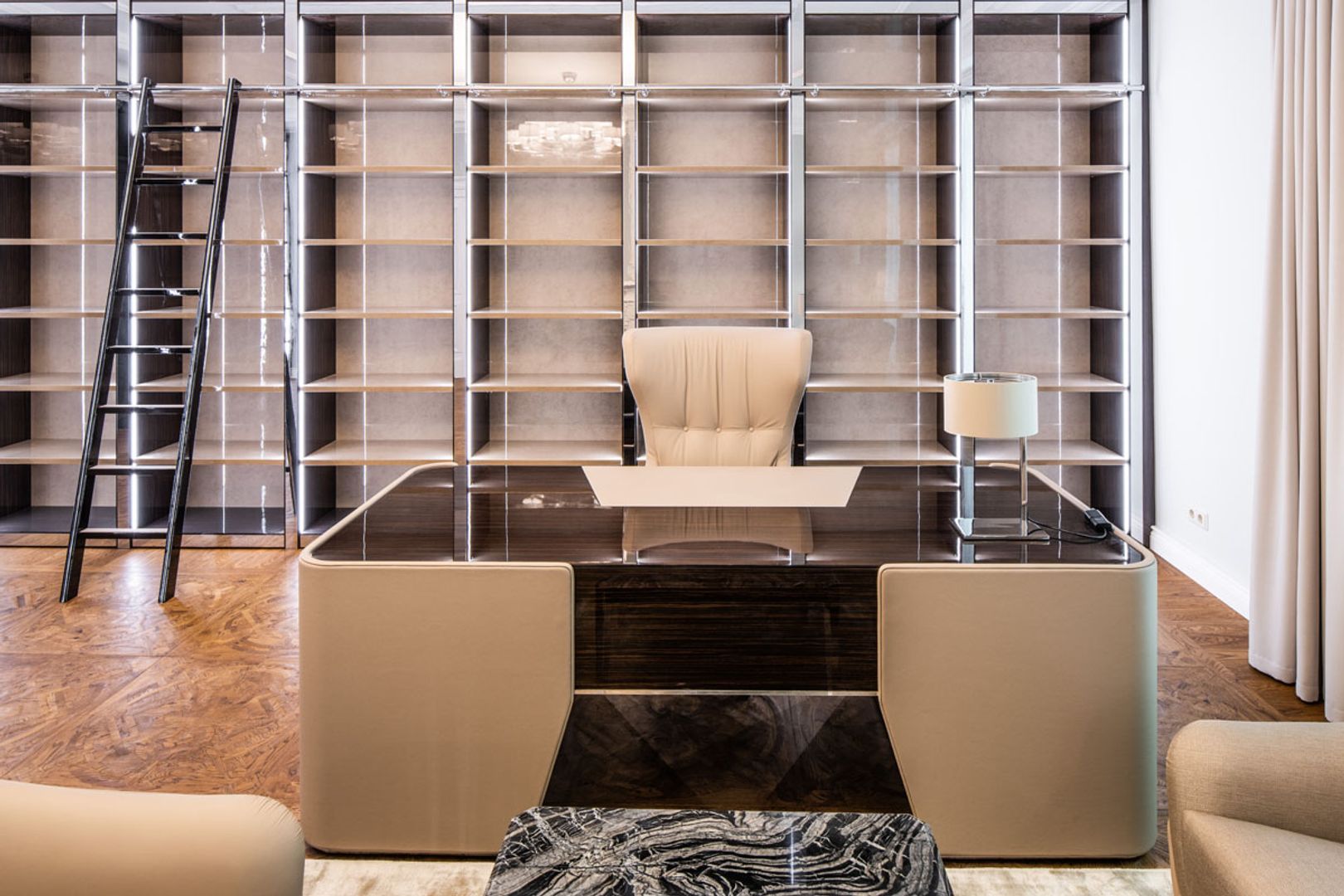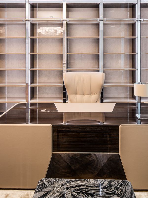 Bei der Realisierung dieses Projektes wurde auf alle Details Wert gelegt. Die Umsetzung der Kundenwünsche, die technischen Herausforderungen und die Abstimmung von Farben und Materialien wurden perfekt zusammen geführt. Ebenholz Hochglanz lackiert, feinste Leder und Bezüge, Farben mit Krakelierung und Vorhangstoffe, sowie Hochglanz polierte Metalle, wurden verwendet. Eine individuelle Maßanfertigung, umgesetzt durch unsere Innenarchitekten und Tischler.