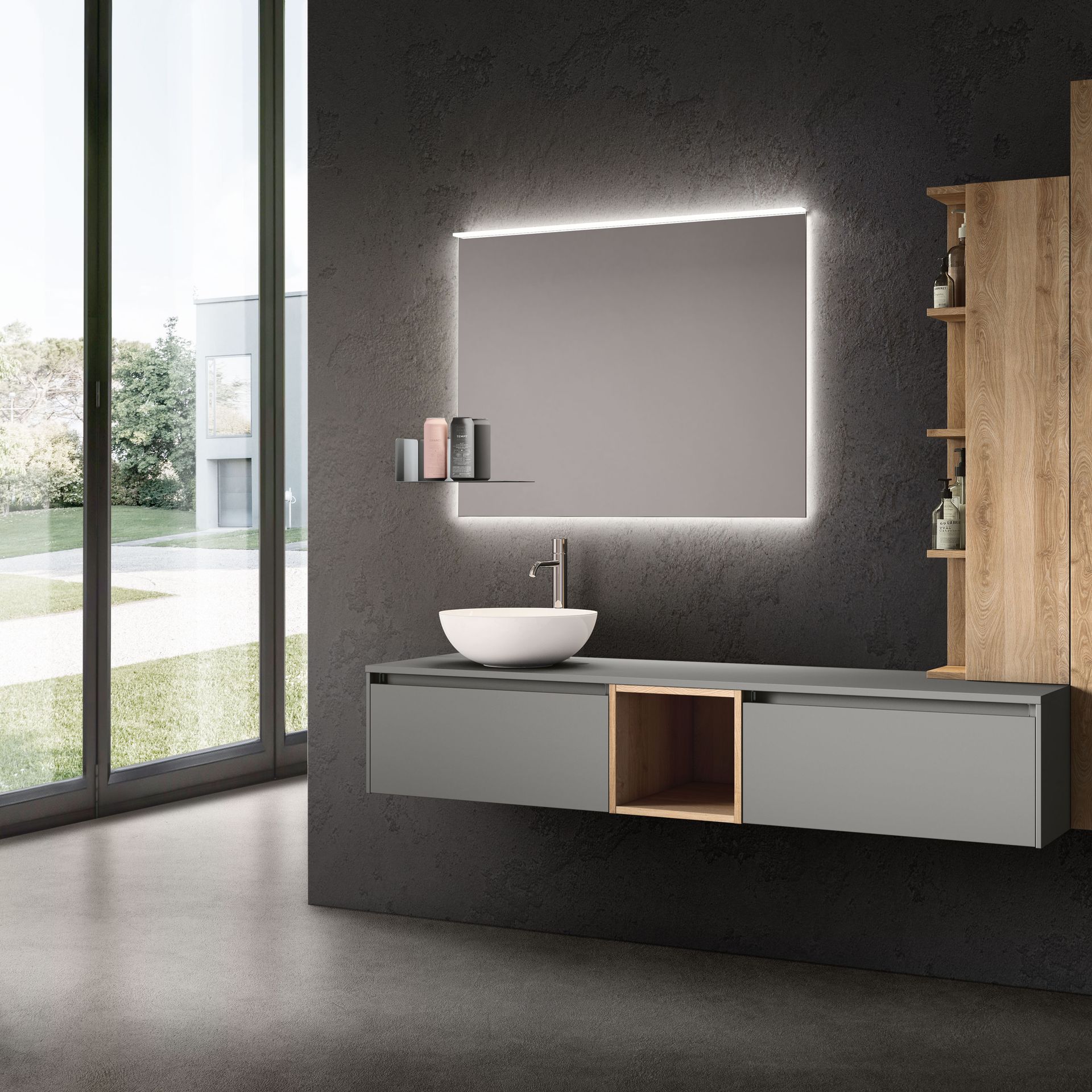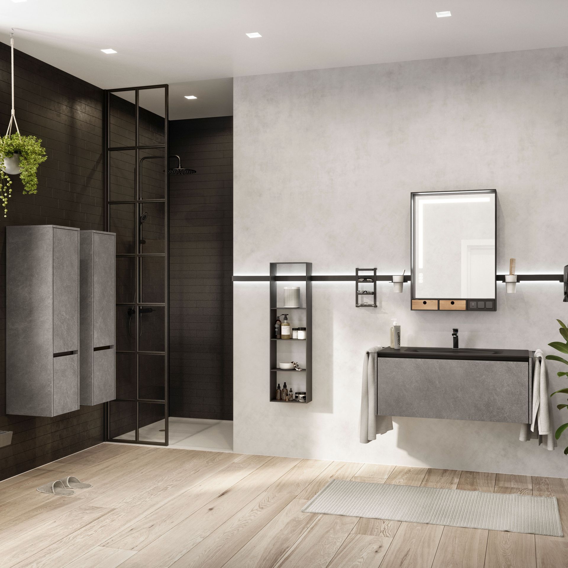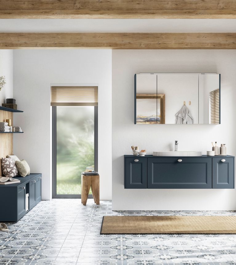 Das Badezimmerlicht sollte nach Möglichkeit freundlich sein. Denn wenn einen das eigene Spiegelbild nicht nur unausgeschlafen, sondern auch bis ins letzte Detail ausgeleuchtet am Morgen begrüßt, dreht man am liebsten gleich wieder um. Für einen guten Start in den Tag ist daher eine ausgewogene und stimmungsvolle Beleuchtung vorteilhaft. Sie sorgt außerdem für ein freundliches Wohlfühlambiente und ideale Lichtverhältnisse. Eine extra Wandlampe oder eine dimmbare Spiegelleuchte machen da bereits einen großen Unterschied.