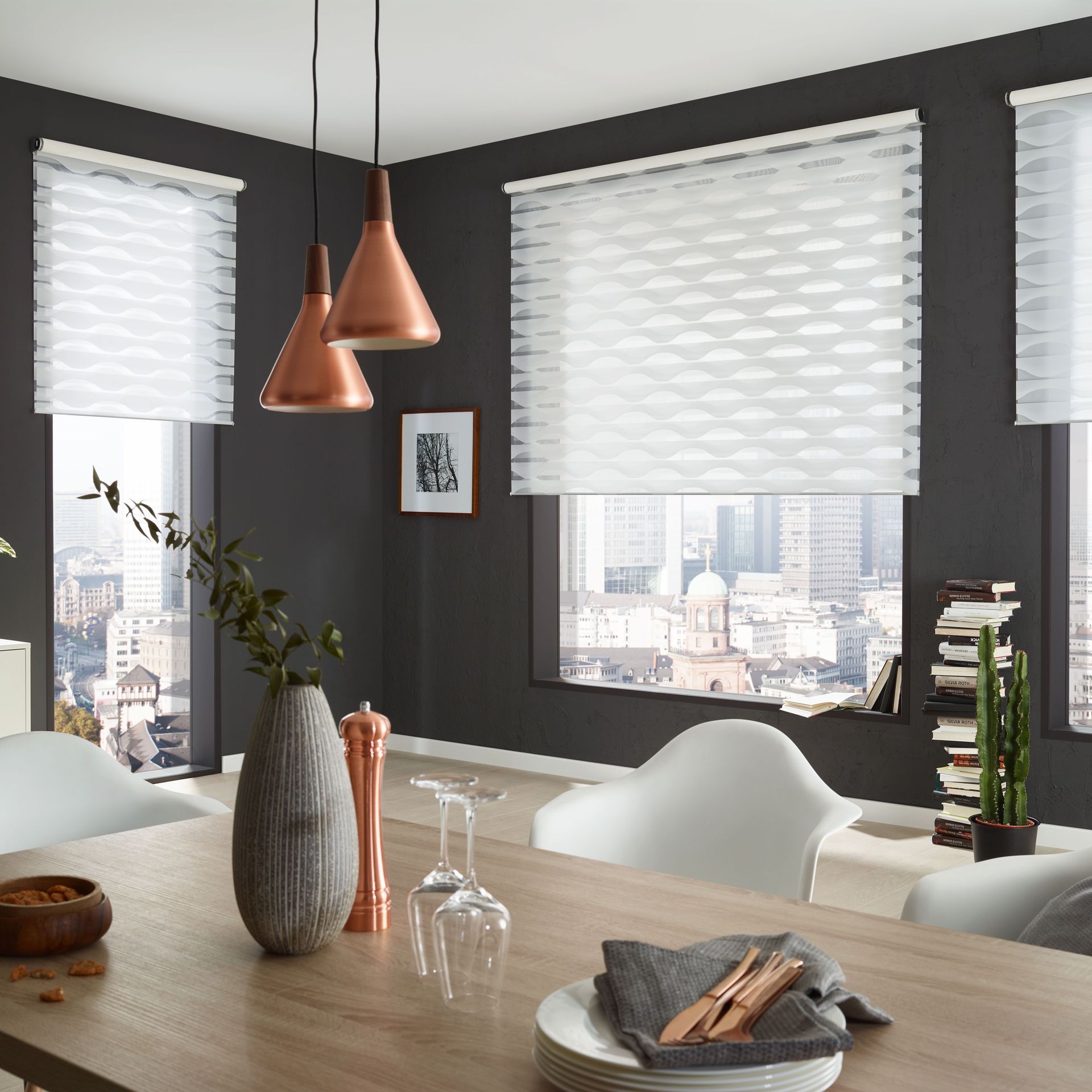 Das Rollo nimmt daher im Interior Design genauso eine wichtige Funktion ein wie es mit einer breiten Palette an Bedienungs- und Montagemöglichkeiten sein Funktionsspektrum seit anno dazumal erweitert hat. Varianten in unterschiedlicher Transparenz sowie innovative Gewebearten bieten einen großen Reigen an Interpretationsmöglichkeiten. Abdunkelung nach Wunsch schaffen dabei unterschiedlichste Lichtdurchlässigkeitsvariationen von durchsichtig bis blickdicht. Spezialgewebe unterstreichen durch ihre Oberflächenstruktur vor allem im Objektbereich ein stylishes Flair. Elektrisch Antriebe und automatische Steuerungen begeistern Hightech-Freaks.
